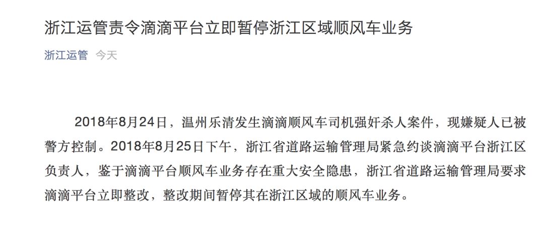 今天下午,浙江省道路运输管理局紧急约谈滴滴平台浙江区负责人,鉴于滴滴平台顺风车业务存在重大安全隐患,浙江省道路运输管理局要求滴滴平台立即整改,整改期间暂停其在浙江区域的顺风车业务。