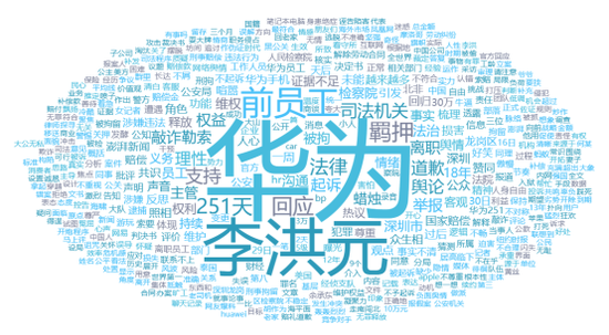 根据关键词云可以看出,“支持”“法律”“起诉”“理性”等词反映了网友对于该事件中华为的回应更为关注。