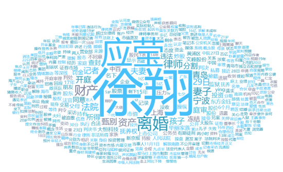 根据关键词云可以看出,除“徐翔”“应莹”“离婚”等词语成为关键词外,“财产”“分割”“冻结”“查封”等词也引起了网友的关注和讨论。