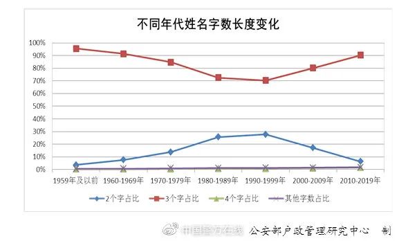 目前,我国除部分少数民族外,大部分人的名字多为二字(单姓单名)、三字(单姓双名或复姓单名)或四字(复姓双名),超出四字的比较少见。从不同年代看,三字姓名一直占据主流。特别是上世纪六十年代以前,宗族、家族姓名文化深入人心,取名字往往带上标识辈分的字,因此二字姓名较少。改革开放后,现代文化思潮不断影响着取名字的方式,人们取名追求简洁好记,二字姓名人数占比由上世纪六十年代的7.6%增长到九十年代的27.6%。21世纪以来,随着人口规模快速增长和人口流动日益频繁,重名现象多了起来,为了降低重名率,三字姓名又逐渐增多,目前,三字姓名占比超过90%,二字姓名占比减至6.3%。四字及其他字数姓名虽使用人数较少,但一直保持增长态势,分别由上世纪五十年代的0.3%、0.4%提高到目前的1.6%和1.7%。