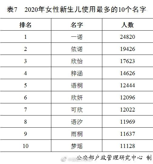 2020年出生并已经进行户籍登记的女性新生儿中,使用频率最高的10个名字依次为:“一诺”“依诺”“欣怡”“梓涵”“语桐”“欣妍”“可欣”“语汐”“雨桐”“梦瑶”。与2019年相比,“一诺”“依诺”“欣怡”依旧位列三甲,“语桐”“可欣”“语汐”“梦瑶”进入前十。