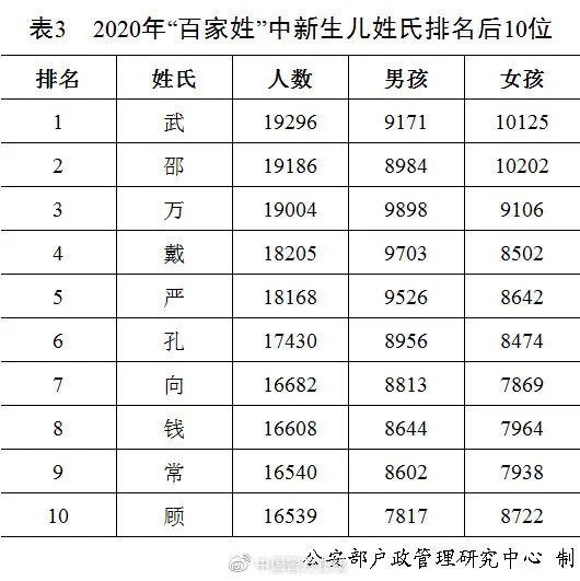 截止到2020年12月31日,2020年出生并已经到公安机关进行户籍登记的新生儿共1003.5万,其中男孩529.0万,占52.7%,女孩474.5万,占47.3%。2020年“百家姓”中新生儿登记姓氏最多的是“李”,共72.6万人,最少的是“顾”,仅1.7万人。