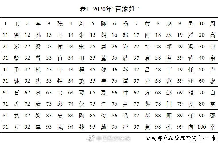 按户籍人口数量排名,2020年的“百家姓”与2019年相比变化不大。“王”“李”“张”“刘”“陈”依旧名列前五,五大姓氏人口总数占全国户籍总人口的30.8%。