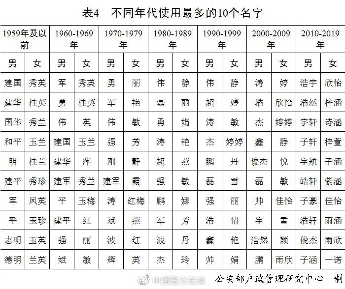 不同时代名字的变化,折射了经济社会发展、生活水平提升和思想观念革新。新中国成立时,为了纪念这一具有重大意义的历史时刻,很多男性取名为“建国”“建华”,很多女性选用“英”“兰”。上世纪六七十年代,人名里“军”“勇”“英”“丽”等比较常见,时代延续性较为突出。八十年代,人名里很多选用“伟”“磊”“静” “丽”,反映人们一心追求简洁、平静、朴实的生活心态。九十年代名字则注入了风雅的文化元素,“杰”“浩”“婷”“雪”等字更多地被选用。进入21世纪后,“涛”“浩宇”“浩然”“婷”“欣怡”“梓涵”等“文艺范儿”的名字大受欢迎。
