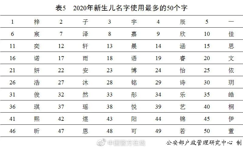 2020年出生并已经进行户籍登记的新生儿名字中,使用频率最高的50个字依次为“梓”“子”“宇”“辰”“一”等。与2019年相比,“玥”“伊”“昕”“可”等字受到新生儿父母的青睐。