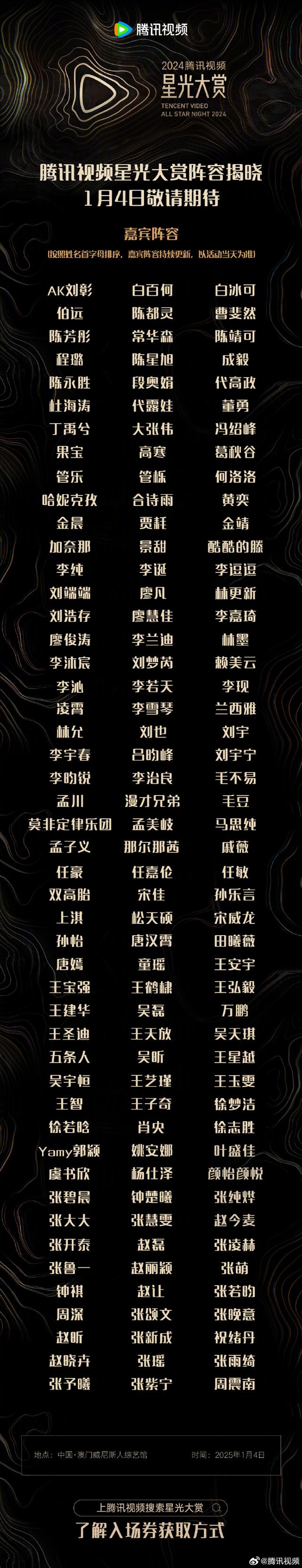 1月4日,腾讯视频星光大赏即将在中国澳门举行,阵容如下↓↓你最期待哪个剧组的登场呢?