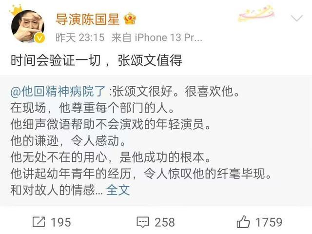 导演陈国星转发该条微博,发文称:“时间会验证一切,张颂文值得。”