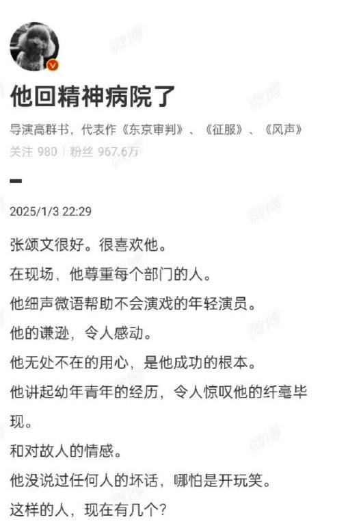 1月3日晚,曾与张颂文合作过的导演高群书发出长文力挺张颂文:“在现场,他尊重每个部门的人。他细声微语帮助不会演戏的年轻演员。他的谦逊,令人感动。他无处不在的用心,是他成功的根本。他讲起幼年青年的经历,令人惊叹他的纤毫毕现和对故人的情感……他没说过任何人的坏话,哪怕是开玩笑。他是一个好人,好演员,谨小慎微、战战兢兢、勤恳努力,即使成名之后。”