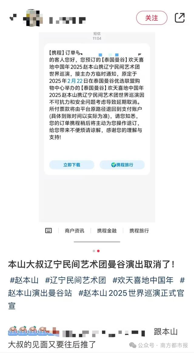 据@南方日报 消息,1月11日,有网友发帖称,收到“赵本山曼谷世界巡演取消”的短信。