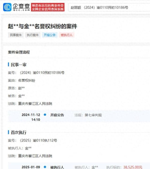 近日,企查查APP显示,赵丽颖诉金某某名誉权纠纷一案中,被告金某某被强制执行38525元。
