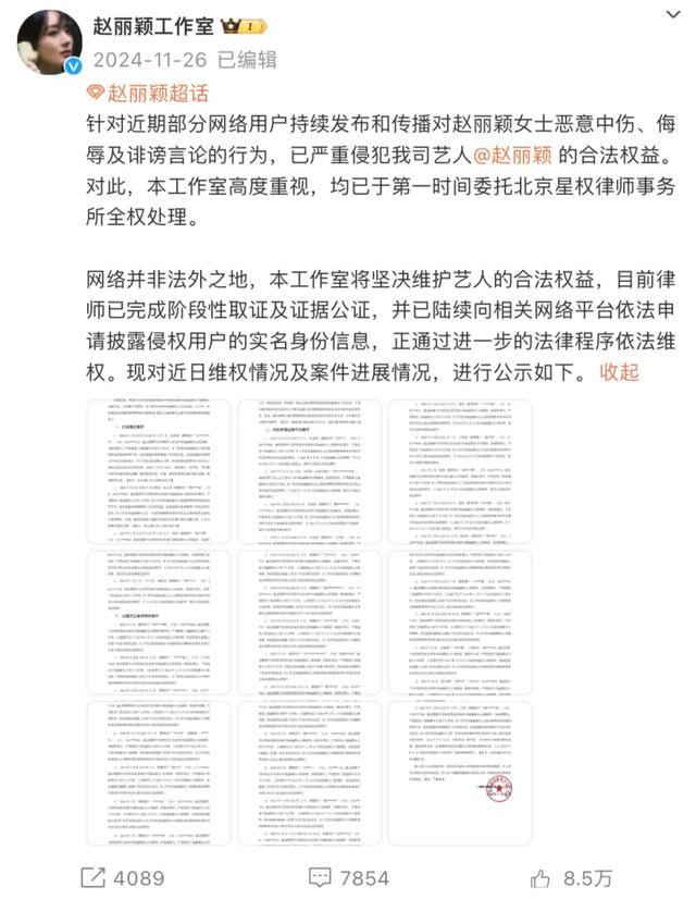 2024年11月26日,赵丽颖工作室曾发文称,针对近期部分网络用户持续发布和传播对赵丽颖女士恶意中伤、侮辱及诽谤言论的行为,已严重侵犯该司艺人赵丽颖的合法权益。