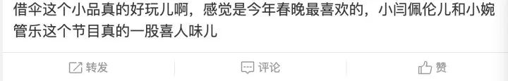 十多分钟的小品《借伞》让观众叫好。节目单公布后,看着18个人的演出人员名单,有网友调侃:什么伞啊要18个人借?