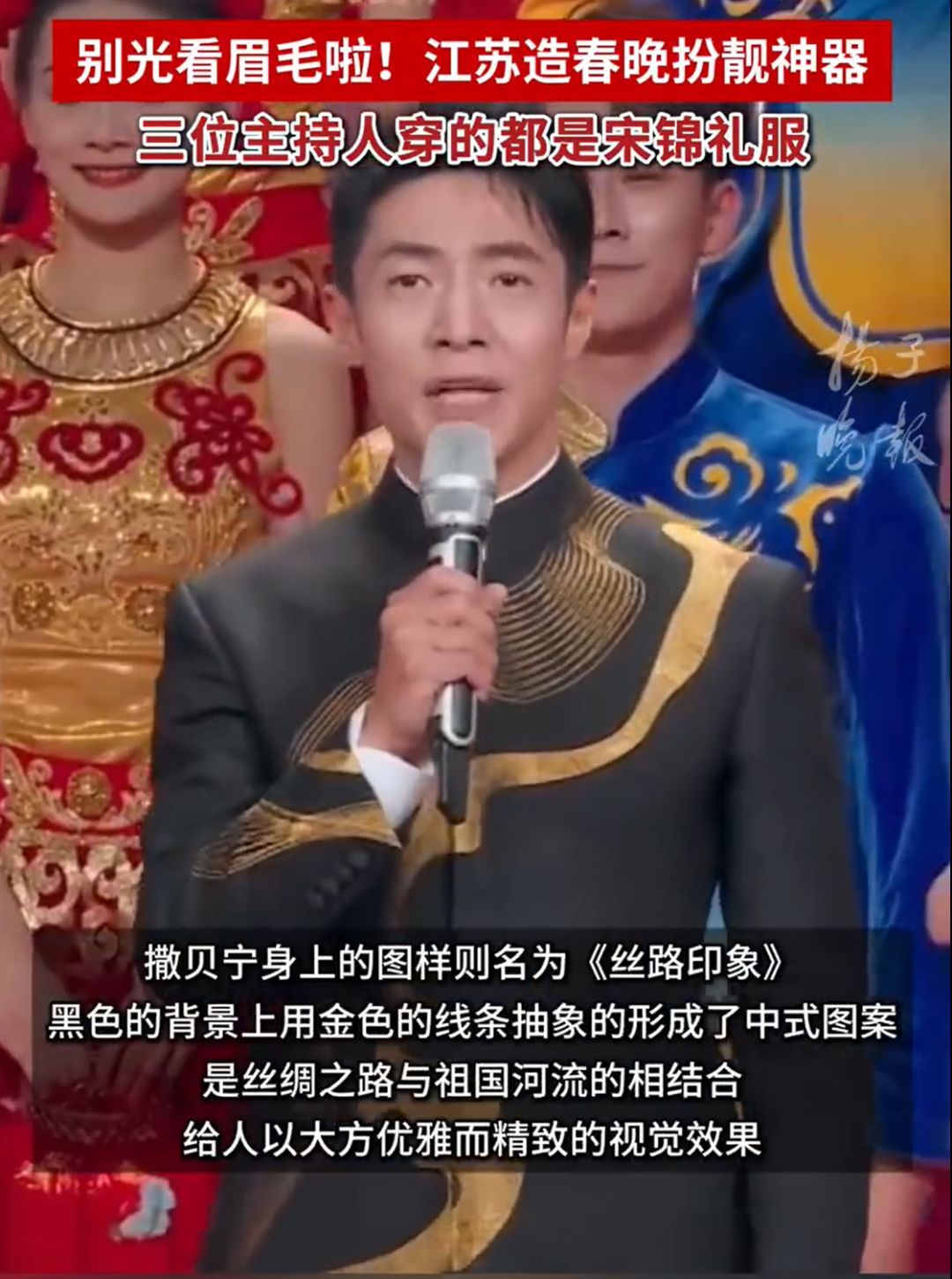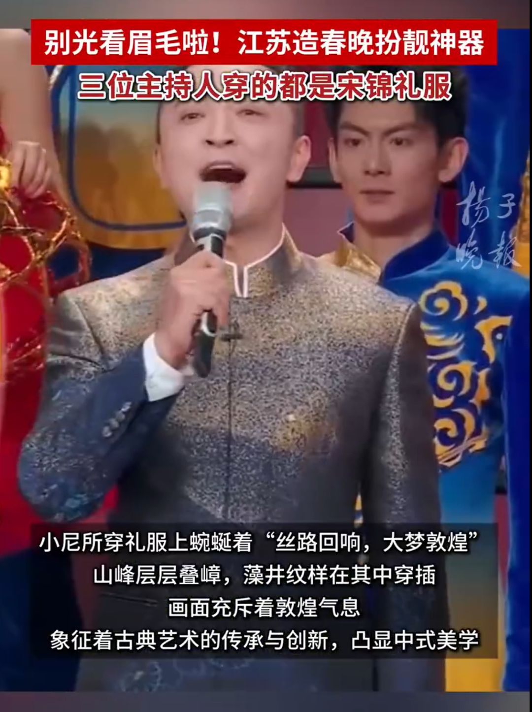 据扬子晚报,主持人尼格买提和撒贝宁穿的宋锦江苏造!中国丝绸协会副会长、苏州上久楷丝绸科技文化有限公司董事长吴建华告诉记者,小尼所穿礼服大有乾坤,衣服上蜿蜒着“丝路回响,大梦敦煌”,山峰层层叠障,藻井纹样在其中穿插,凸显中式美学。