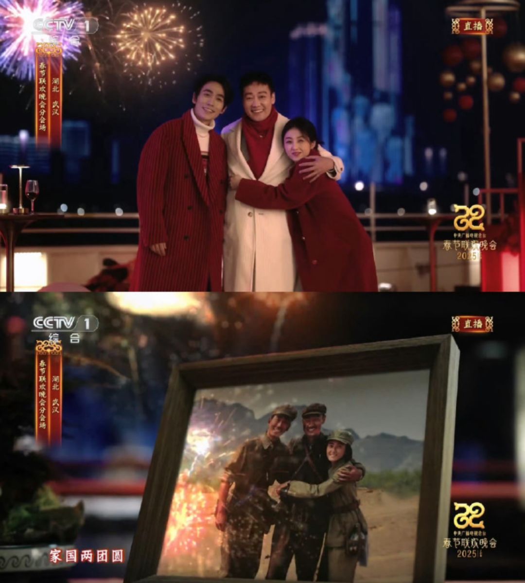 武汉分会场与电影《志愿军2》梦幻联动,春晚上的朱一龙、辛柏青、张子枫再现 《志愿军2》中的动作。《志愿军2》中,李想(朱一龙 饰)与父亲李默尹(辛柏青 饰)、妹妹李晓(张子枫 饰)为一家三口。网友:万家灯火处,家国两团圆,李想一家三口团聚了!