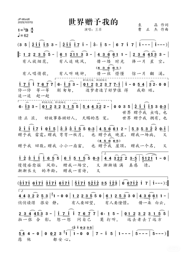 他提到,近年春晚作品创作会特别强调“与生活共创”。在张异凡看来,《世界赠予我的》就是一首“源于生活,与生活共创的歌”,也是“春晚高品质歌曲节目的代表”。春晚歌曲推陈出新,寻求的就是这样“既有思想性又有观众认同感的作品”。歌手王菲在七年后再度献唱春晚,看重的正是这首词曲带来的情感共鸣。