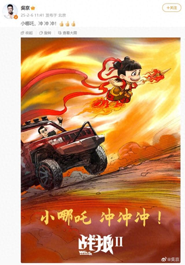 2月6日,吴京发图祝贺《哪吒2》票房再创新纪录。据灯塔专业版,《哪吒之魔童闹海》票房已超《战狼2》56.94亿,成中国电影票房总榜第二名。