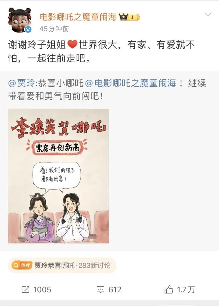 《你好,李焕英》导演贾玲更在线恭喜小哪吒,“电影《哪吒之魔童闹海》,继续带着爱和勇气向前闯吧!”《哪吒之魔童闹海》也暖心回复道,“世界很大,有家、有爱就不怕,一起往前走吧。”