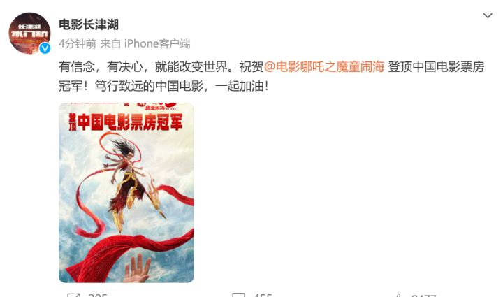 电影《长津湖》发出祝福海报,祝贺哪吒登顶,“笃行致远的中国电影,一起加油”!