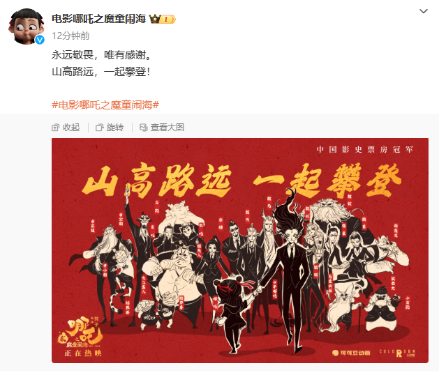 电影《哪吒之魔童闹海》官博发布全家福海报回应登顶,并配文称:“永远敬畏,唯有感谢。山高路远,一起攀登!”