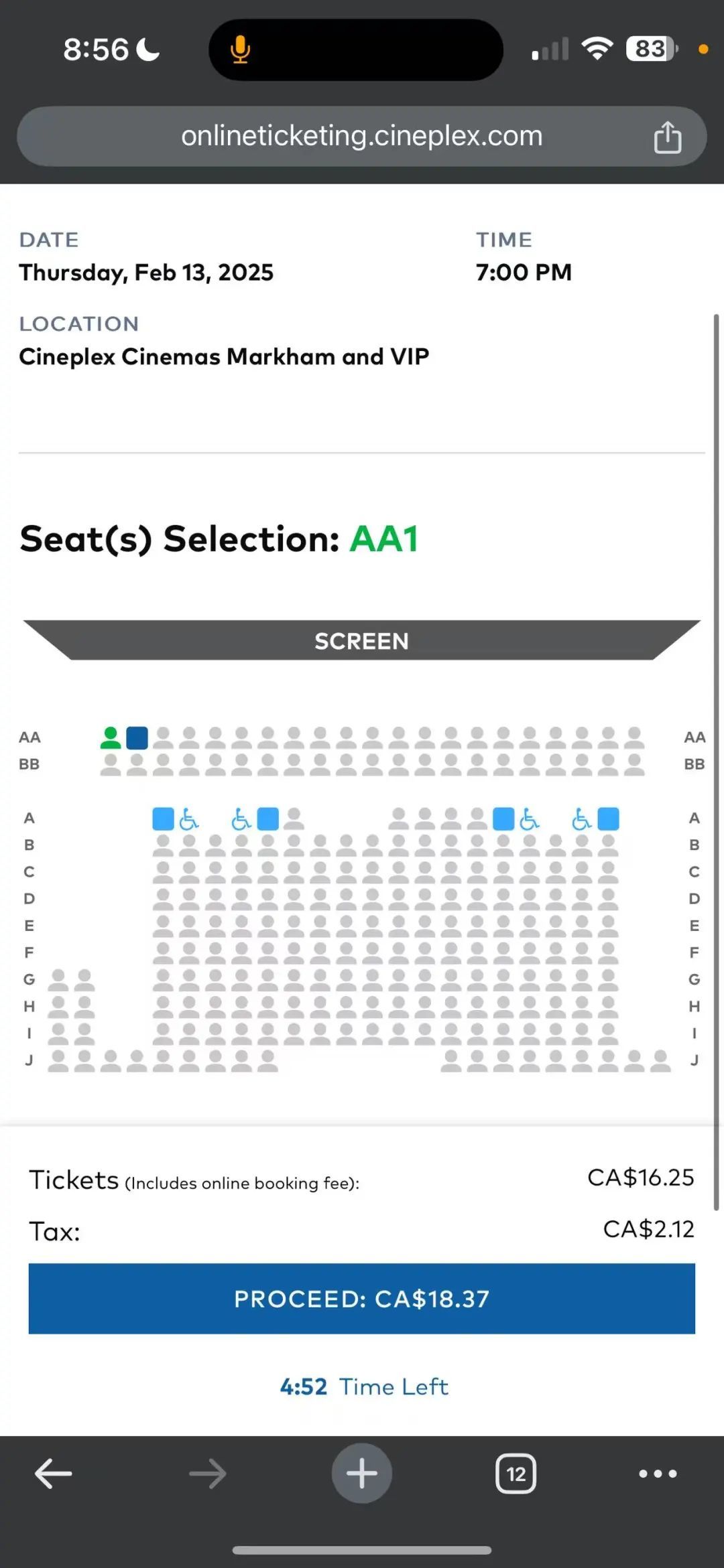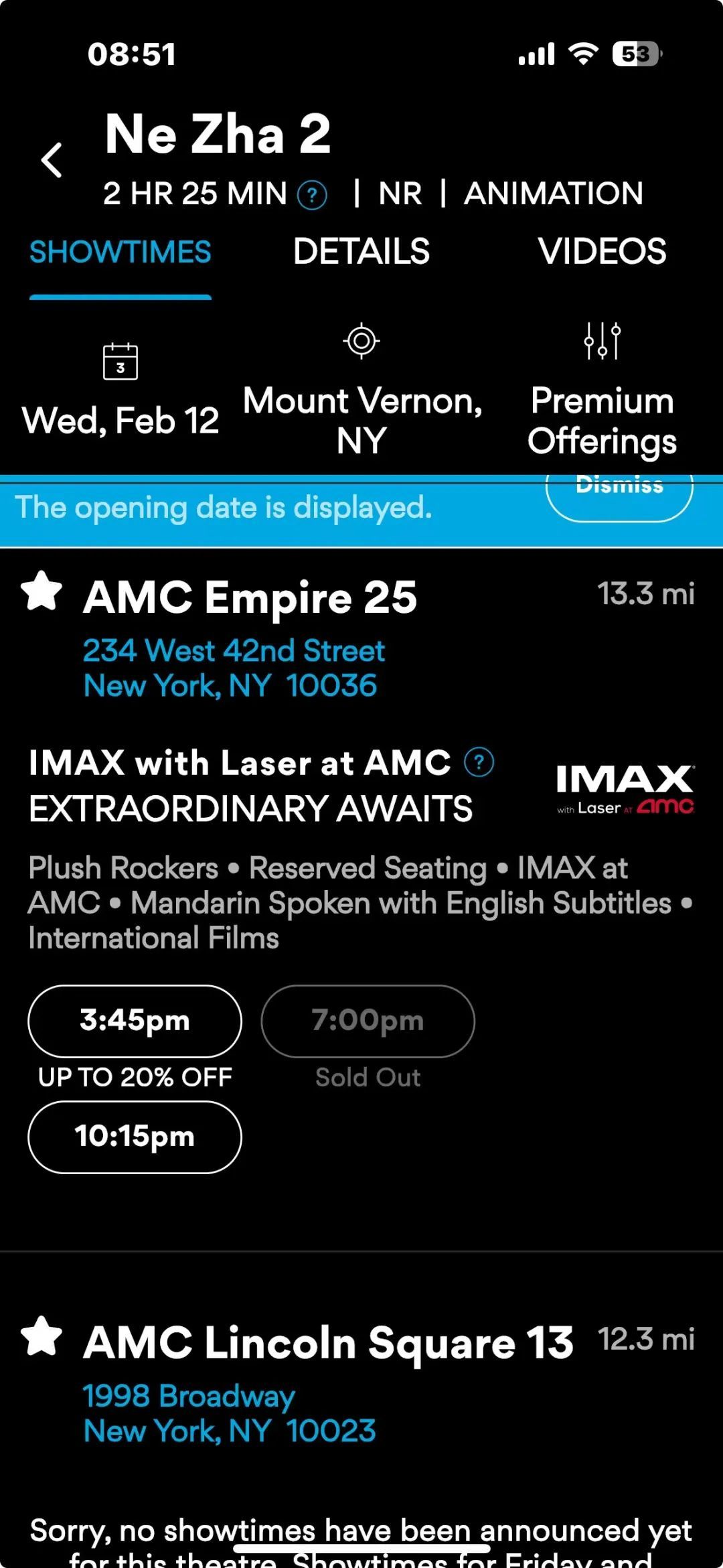 “原计划是2月14日上映的,最近档期提前了。身边很多人都在抢票。首映当天的票基本已经抢空了,只有第一排还有空位。”一位在美国纽约的华人鹿桑(化名)告诉顶端新闻记者。据其提供的电影票截图显示,12号当天部分时间段已售空,未售空时间段仅剩较偏的位置。