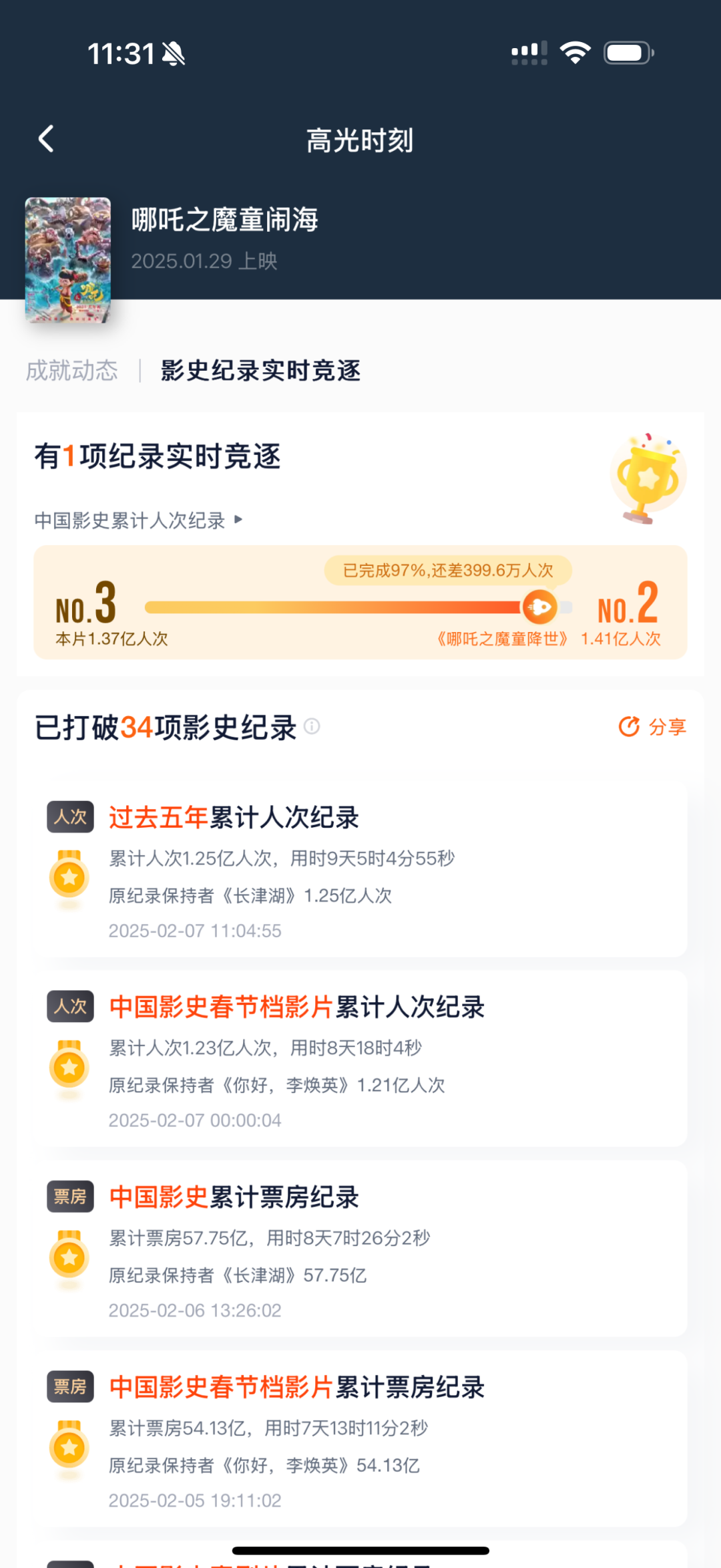 截至2月8日17时07分,电影《哪吒之魔童闹海》票房突破72亿,登顶全球单一市场票房榜。目前《哪吒2》电影已获包括国内影史累计票房纪录、中国影史春节档影片累计人次纪录等共34项成就。《哪吒2》用时不到9天即冲顶中国影史票房榜。