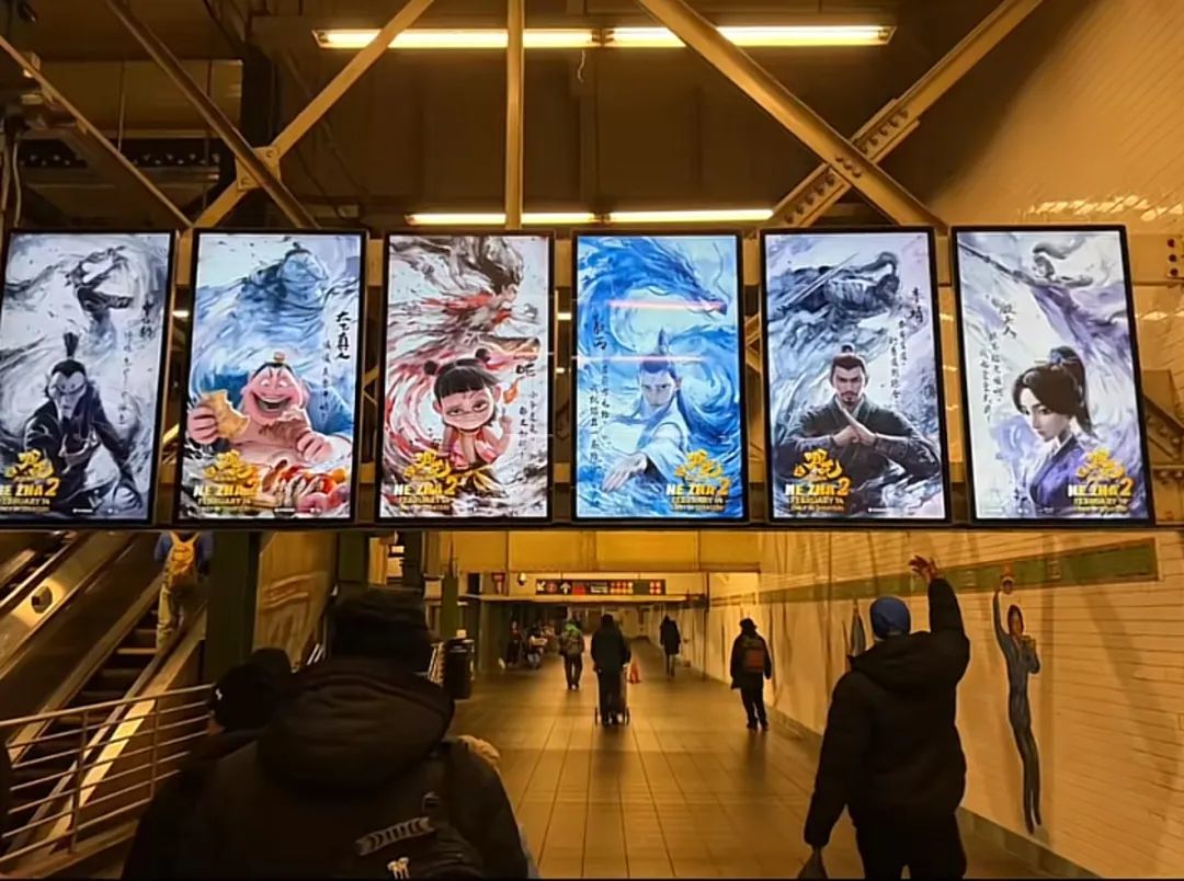 纽约时代广场地铁站内的哪吒电影海报