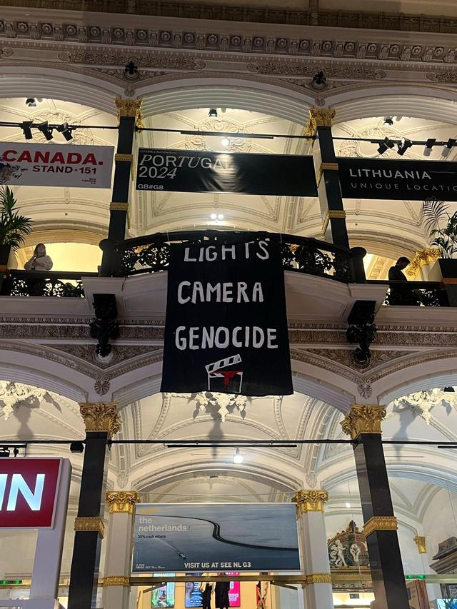 去年柏林电影节交易市场上,抗议者打出条幅指控电影节是种族灭绝的同谋。