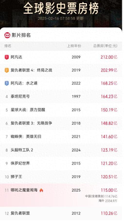 截至今早8时许,《哪吒2》总票房突破115亿,距离全球影视票房榜第十名只差5.5亿,很有可能今天《哪吒2》将进入全球影视票房榜前10。