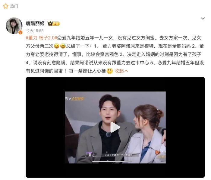 再者,#董力 杨子2.0# 这个词条确实也很有东西,目前舆论场对董力的讨论热度正在稳步上升,大有黑红势头。但说实话,该词条指向的董力真人秀内容很难说达到了“杨子”那般炸裂。所谓杨子2.0,指的是董力在首期节目里说话太“直男”、网友认为两人相处模式很难看出爱意,比如董直男发言妻子今天衣服不太配这个头纱、阿诺说董结婚五年都没见过她闺蜜等,可能确实有网友觉得这很“爹”,但真的没达到杨子那种爹的程度。