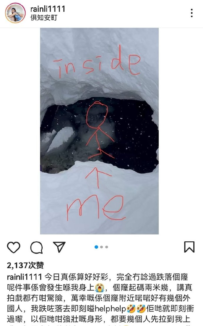 近日,演员李彩桦透露在日本滑雪时不慎掉进2米深雪洞,万幸的是在那个深洞附近刚好有几个外国人,她掉下去后立刻喊救命,他们就冲过来,把她拉上来了。
