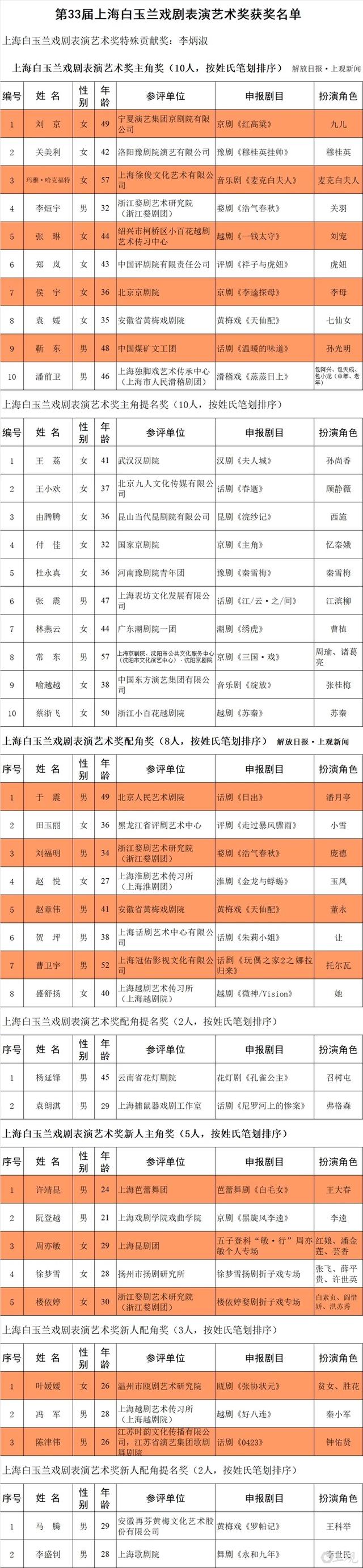 活动现场揭晓第33届上海白玉兰戏剧表演艺术奖各奖项名单(按姓氏笔画排序)。