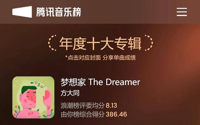 今年1月,方大同第9张专辑《梦想家The Dreamer》刚获得腾讯音乐榜2024年度榜单年度十大专辑,该专辑发行于2024年10月18日。