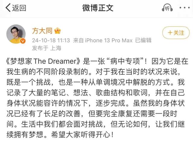 去年10月18日,方大同发文表示,《梦想家The Dreamer》是一张“病中专项”!因为它是在我生病的不同阶段录制的。对于我在当时的状况来说,既是一个挑战,也是一种从单调境况中解脱的方式。我记录了大量的笔记、想法、歌曲结构和歌词,并在自己身体状况能容许的情况下,逐步完成。虽然我的身体状况已经有了长足的改善,但要完全康复还需要一段时间。生活中我们都会面对挑战,但无论如何,让我们继续拥有梦想。希望大家听得开心!