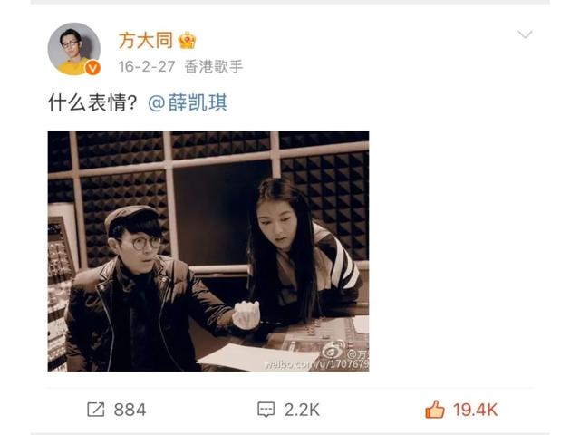 方大同的2313条微博里(统计数据时),有234条提到薛凯琪,转发了185条薛凯琪的微博,直接@薛凯琪8条,转发别人@薛凯琪微博41条,剩下的是吃饭、睡觉、录音。
