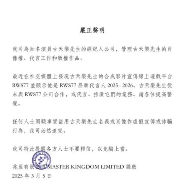 3月5日,两人的经纪公司先后发布声明,指出该宣传片为合成影片,否认其与有关游戏平台合作,或代言、推广它们的业务,提醒各方人士不要轻信,以免受骗上当。对于盗用两人名义或肖像作虚假宣传或诈骗的行为,公司必然追究。