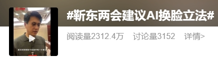 同日,话题#靳东两会建议AI换脸立法#,冲上热搜第一。
