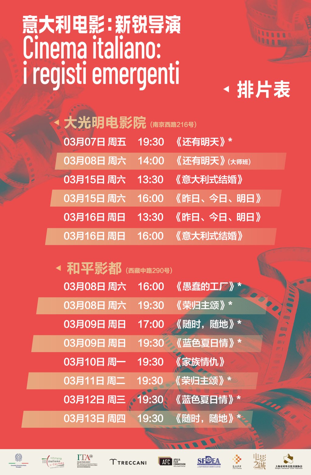 活动海报本次“新锐导演展”于3月7日至16日在上海大光明电影院、和平影都展映《还有明天》《荣归主颂》《蓝色夏日情》《随时,随地》《愚蠢的工厂》及《家族情仇》等6部影片,均为意大利新锐导演的优秀长片首作或第二部长片。前4部电影作品的导演将出席每一场映后,希望与上海观众互动,共享电影的魅力;《愚蠢的工厂》导演将线上与观众见面。此外,展映活动还特别呈献意大利电影大师维托里奥·德·西卡的两部经典作品《意大利式结婚》与《昨日、今日、明日》。