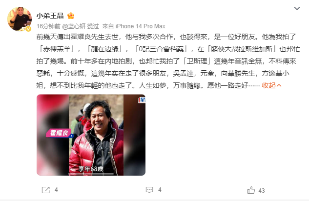 霍耀良导演病逝消息被确认后,著名导演王晶在个人社交账号发文悼念。他表示,二人曾多次合作,私下也谈得来,霍耀良是他的一位好朋友。