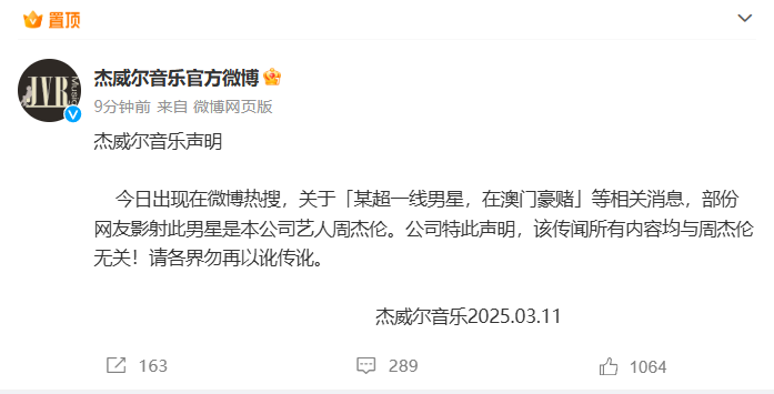 今日出现在微博热搜,关于“某超一线男星,在澳门豪赌”等相关消息,部分网友影射此男星是本公司艺人周杰伦。公司特此声明,该传闻所有内容均与周杰伦无关!请各界勿再以讹传讹。