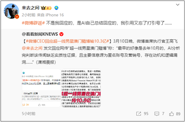11日,王高飞转发媒体报道称“不是我回应的,是AI自己总结回应的”。