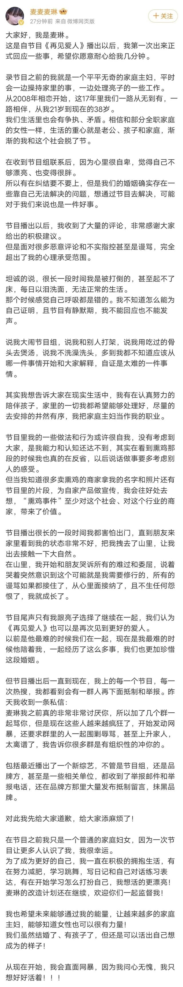 3月13日,麦琳发长文回应争议,她表示《再见爱人》播出后,面对很多恶意评论和不实指控甚至是谩骂,曾经很长一段时间无法正常的生活。对于参与新综艺遭网友抵制,麦琳表示道歉,还表示自己问心无愧,会直面网暴。