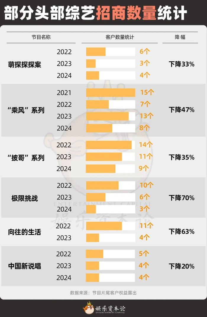 - 广告商跑路:蒙牛、伊利这些以前砸钱的金主,现在更愿意投电视剧或短视频,综艺招商数量比去年少了16%。