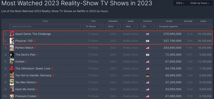 近两年Netflix的素人综艺一直爆款频出,比如2023年的《鱿鱼游戏:挑战赛》累计观看时长达到2.7亿小时,《体能之巅》在 82 个国家/地区进入前十名,累计观看时长也有2.5亿小时。据热门OTT内容搜索平台Kino Lights显示,2024年的大热作品《黑白厨师》则保持了97%的高喜爱度,成为2024年排名第一的综艺节目,而其制作成本大约为100亿韩元(约5000万人民币),仅为某些国内明星综艺成本的三分之一。