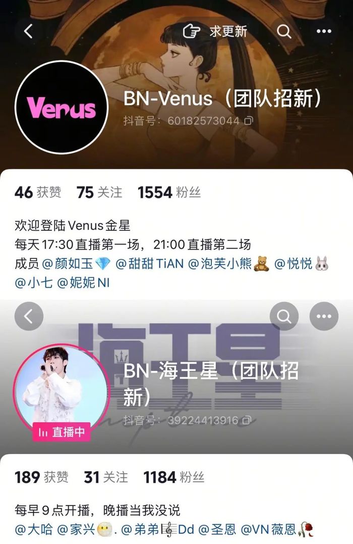 白鸟文澜目前运营着5人男团BN 海王星和6人女团 BN-Venus,每天会直播两场以上。