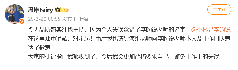冯琳发文:今天品质盛典红毯主持,因为个人失误念错了李昀锐老师的名字。在这里郑重道歉,对不起!事后我也请导演组老师向李昀锐老师本人及工作团队表达了歉意。大家的批评指正我都收到了,今后我会更加严格要求自己,避免工作上的失误。