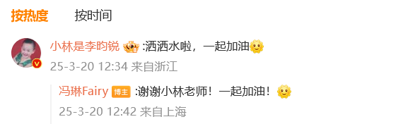 20日中午,李昀锐在冯琳评论区留言回应:“洒洒水啦,一起加油。”