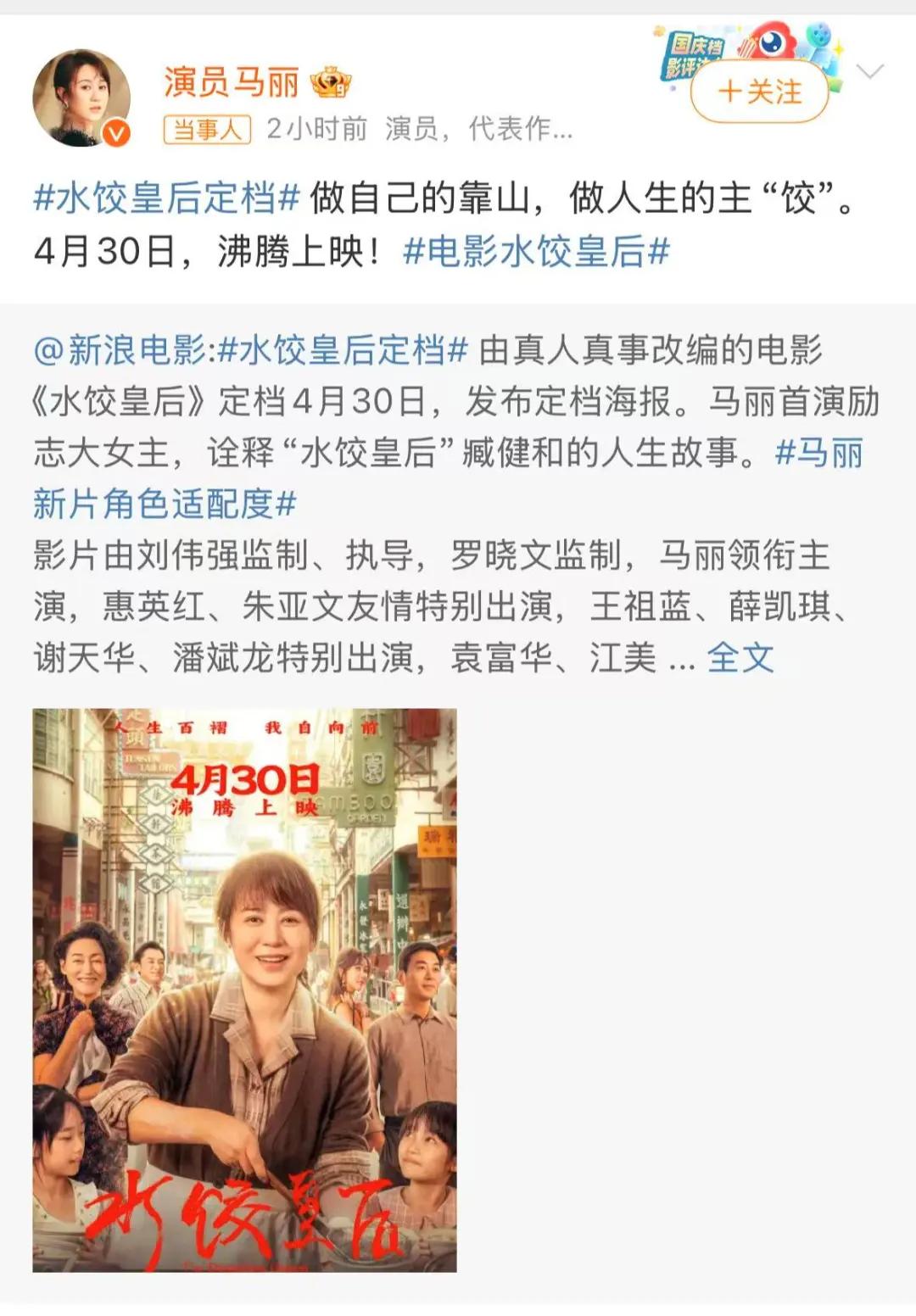 马丽也随后转发定档消息并发声: