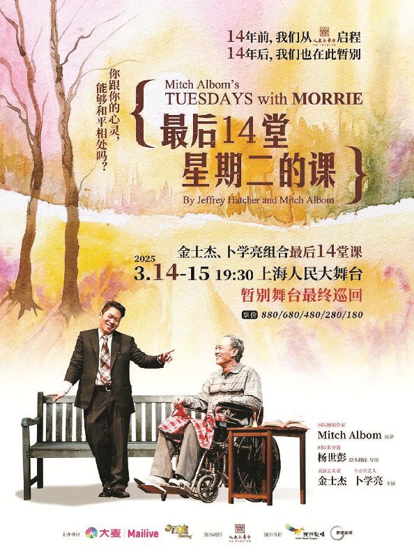 上周末,由金士杰、卜学亮主演的话剧《最后14堂星期二的课》回到中国大陆地区首演地上海人民大舞台,完成了其巡演14年后的收官场。该戏剧作品根据美国著名作家米奇·阿尔博姆的畅销书《相约星期二》改编而成,讲述了一位得了渐冻症的老教授莫利,与他的学生米奇在每个星期二的早晨围绕“生命、死亡、爱、工作、家庭、衰老……”等人生话题,展开的临终前最后的14次对话。