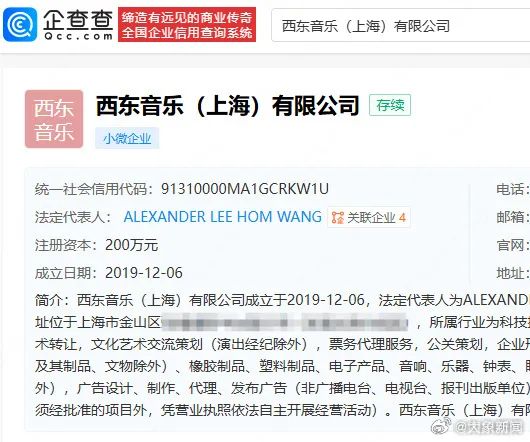 其中,西东音乐(上海)有限公司由ALEXANDER LEE HOM WANG(王力宏)担任法定代表人职务。