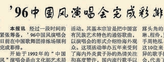 始于1992年的“中国风”演唱会,将中国富有民族艺术特色的通俗歌曲介绍给海外观众。图为1996年演唱会现场。 张风摄